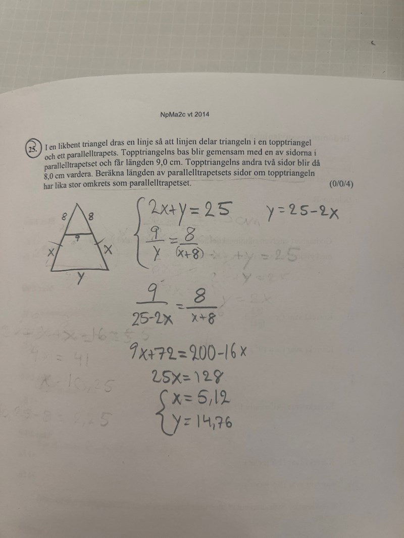Har du inte glömt en sida när du räknar omkretsen för paralelltrapetsen?