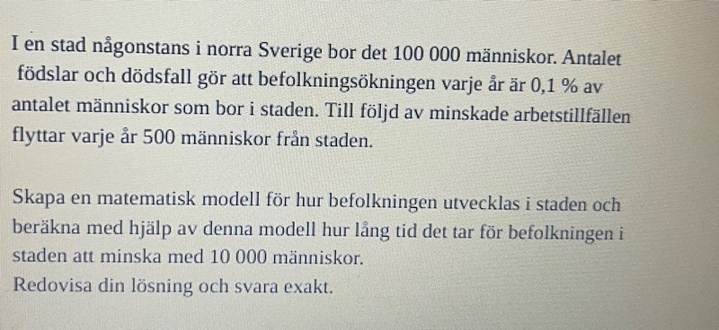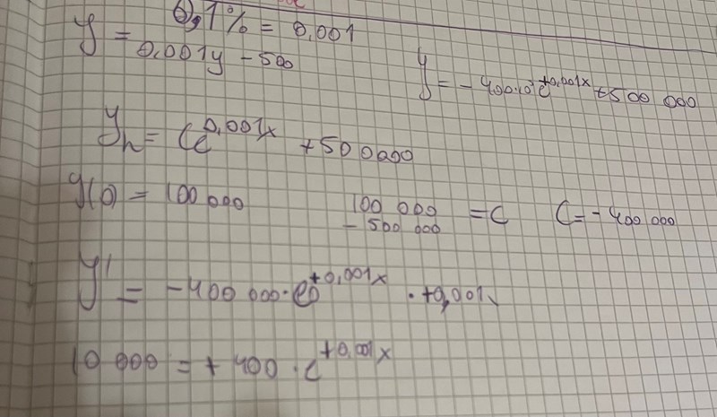 he jag försöker lösa denna uppgift men får fel svar. Jag antar att jag ska sätta 10 000 lika med derivatan men får fel. Sen testade jag med att lägga orginalfunktionen lika med 10 000 men får ändå fel. Vet inte om jag gjort nått skarvfel eller om jag gjort fel sen start. Skulle uppskatta hjälp!!
