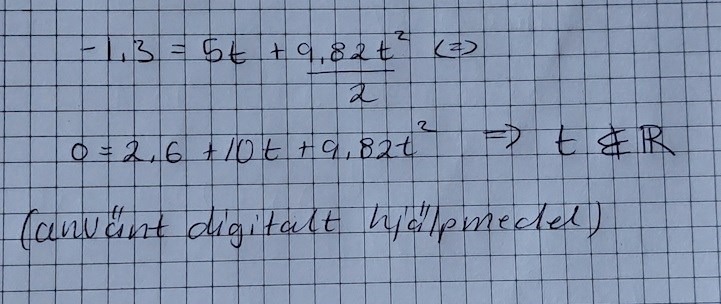 Jag tror jag ser felet: om accelerationen skall dra myntet neråt och neråt är negativt (eftersom att den skall ha färdats 1,3 meter neråt eller -1,3) så måste accelerationen ha negativt tecken. Sätt a= -9,82 och försök igen.