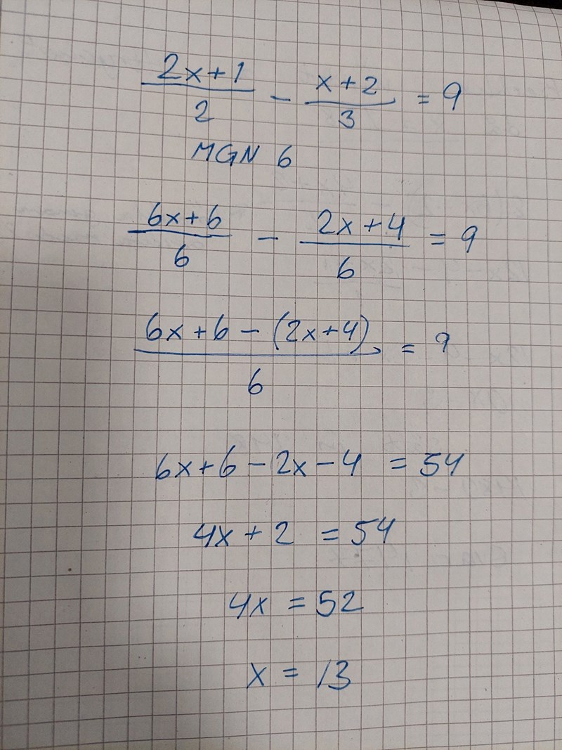 Svaret enligt boken är 55/4, med en ledtråd att "multiplicera båda leden med 6".