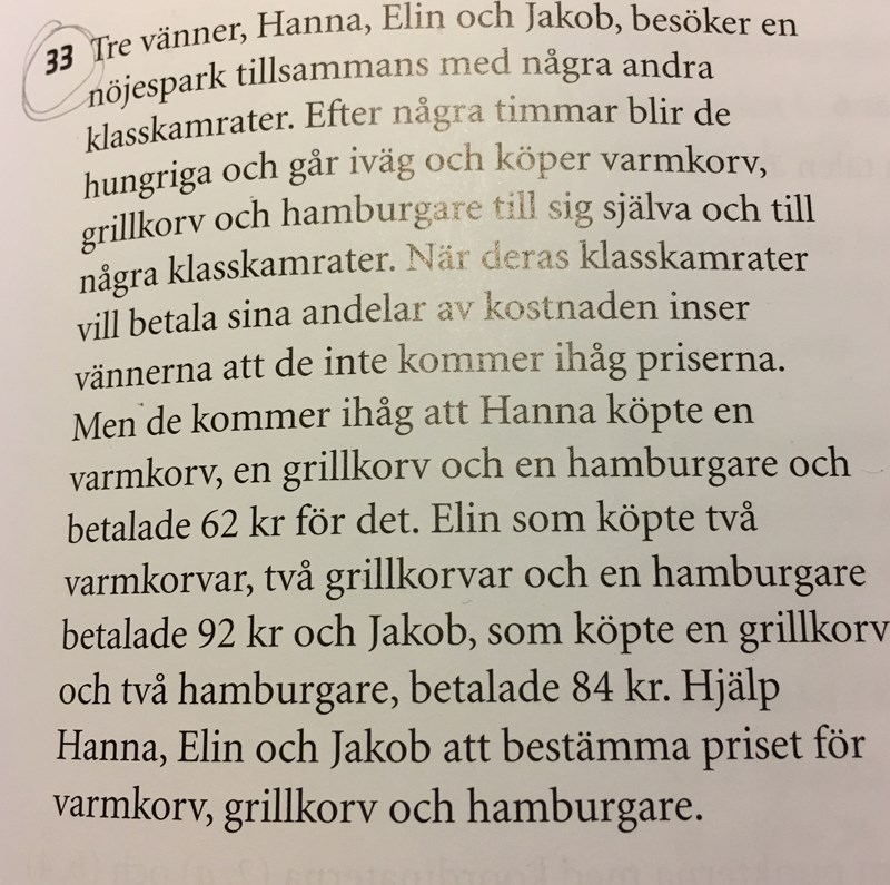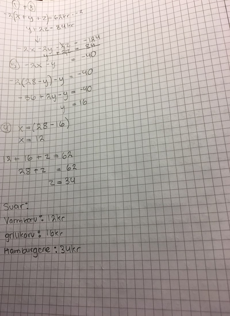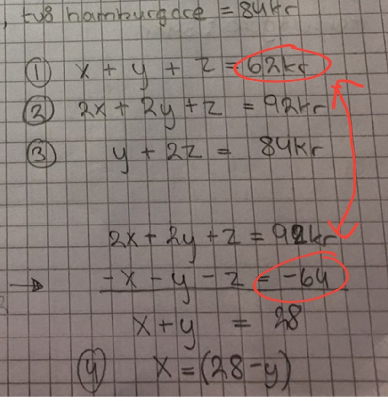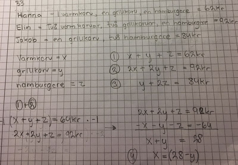 Förstått själv att svaret är fel då man märker när man kontrollerar, detta rätta svaret är varmkorv= 10kr, grillkorv=20kr och hamburgare = 32kr. Vart jag begår felet kan jag dessvärre inte hitta!