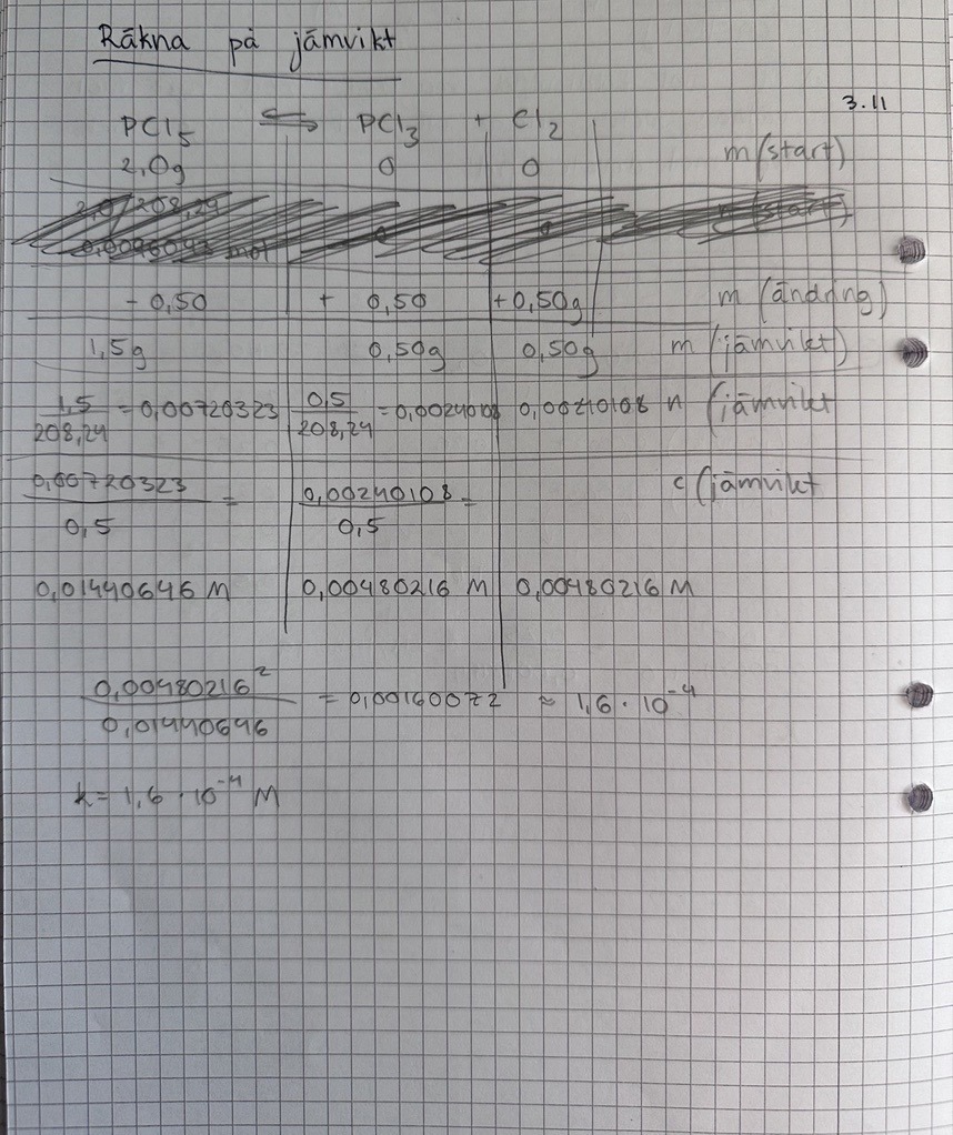man för in 2,0g PCl5 i en kolv som rymmer 0,500dm3 och värmer sedan kolven till 250 grader. PCl5 sönderfaller och en jämvikt ställer in sig. Man finner att det vid jämvikt finns 0,50g Cl2. Beräkna jämviktskonstanten för reaktionen.