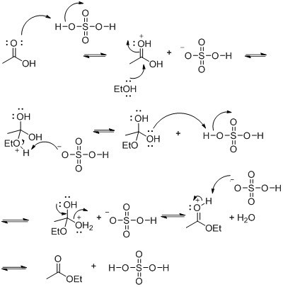 Svavelsyran öppnar upp en snabbare reaktionsväg genom att protonera ett syre i karboxylgruppen, se nedan. Denna reaktionsväg är inte möjlig utan syran utan då krävs en annan, långsammare mekanism.