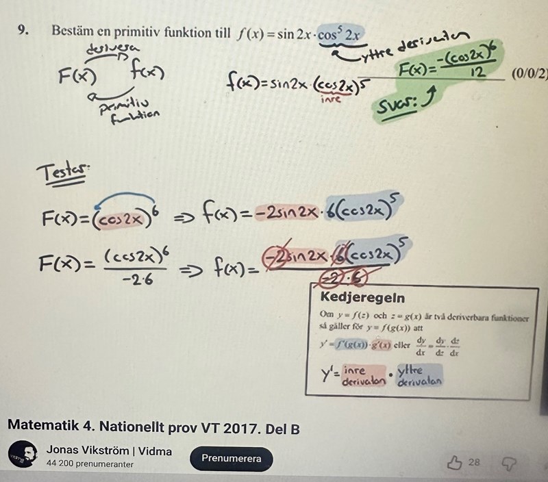 Här har man direkt känt igen att derivatan av cos(2x) är sin(2x)