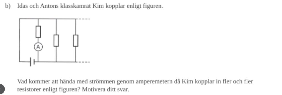 Om man kopplar in fler resistanser borde väl strömmen genom amperemetern att minska? Eftersom det finns fler ställen för strömmen att dela upp sig på och alla resistorer är lika borde den ju dela sig jämnt överallt. Facit säger dock att strömmen genom amperemetern kommer vara oförändrad, men jag förstår inte hur??