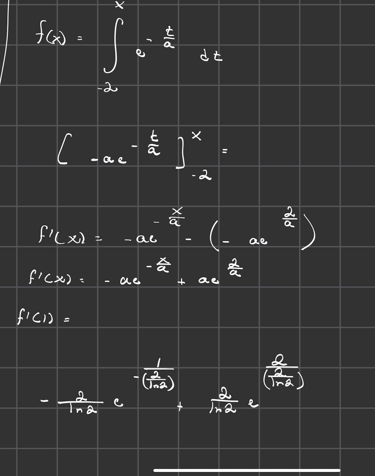 f(x) är här hela integralen. f’(x) blir enligt analysens huvudsats integranden fast du stoppar in x istället för t. Därefter kan du skriva f’(1) och använda ditt a.