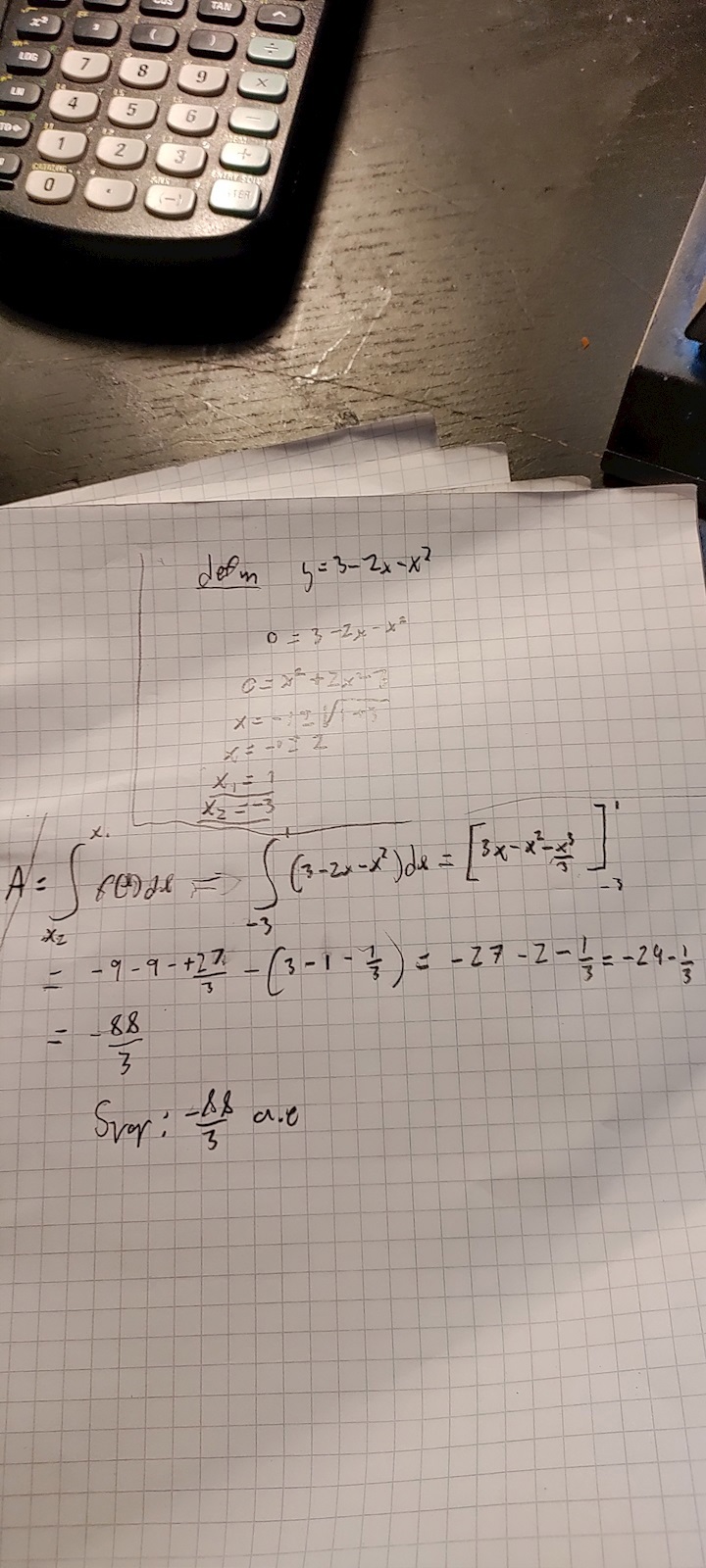 Okej så jag har hittat felet, men svaret jag får är negativt, ska man bara anta att deet ej kan finnas een negativ area, jag får -32/3, där 32/3 är rätt svar.