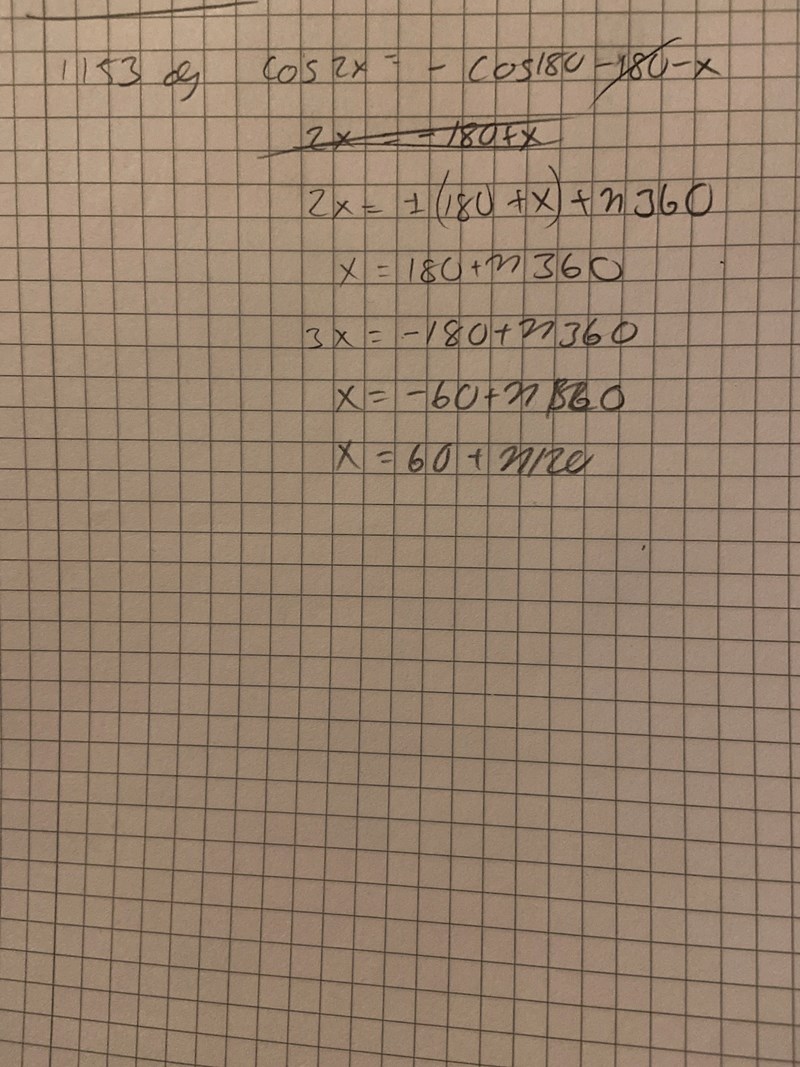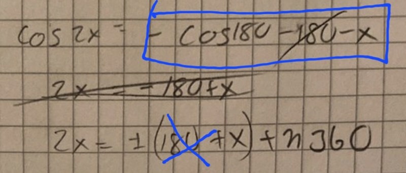 Felet är på första raden, där du i högerledet skriver -cos180-180-x och stryker andra termen. Kan du berätta hur du tänkte där?