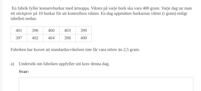 Utgick från formelen (x-m)^2 och adderade summan och det blev 60 sedan delade jag med 10 och fick svaret ca 2,4 och det stämmer inte.