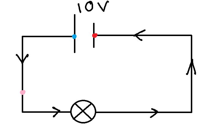 Om man kan räkna med att resistansen i ledningarna är försumbar, så har den rosa och den blå pricken samma potential. Här finns det ingenting spänningen kan fördela sig mellan, det är ju bara en enda glödlampa som "äter upp" hela spänningen. Spänningsfallet över glödlampan är lika stor som spänningsökningen i batteriet.