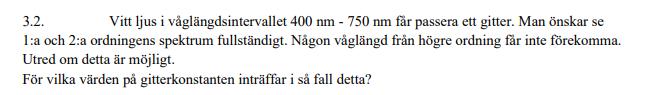 Problemet är att jag inte förstår vad som efterfrågas. Vad betyder "våglängd av högre ordning"? Först tänkte jag att de menade någon våglängd över 750 nm men det det är väl den högsta våglängden i vitt ljus?