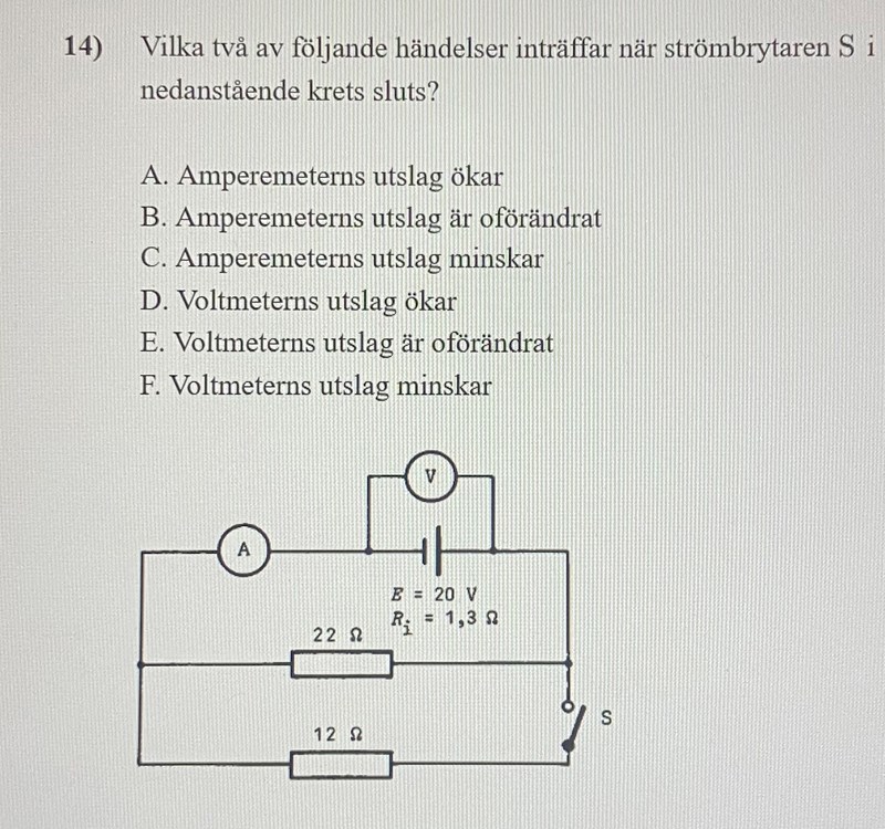 Svaret är A och F. Jag har förstått att strömmen kommer öka eftersom det tillkommer en till förgrening där det kan gå igenom ström och den totala strömmen blir då större. Men jag förstår inte varför spänningen minskar och skulle uppskatta en förklaring till detta :)
