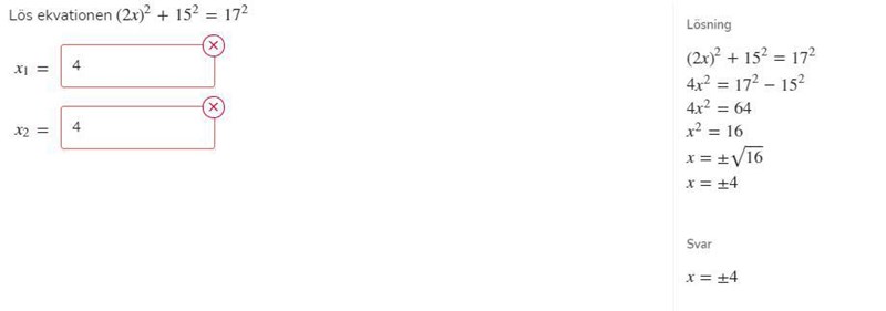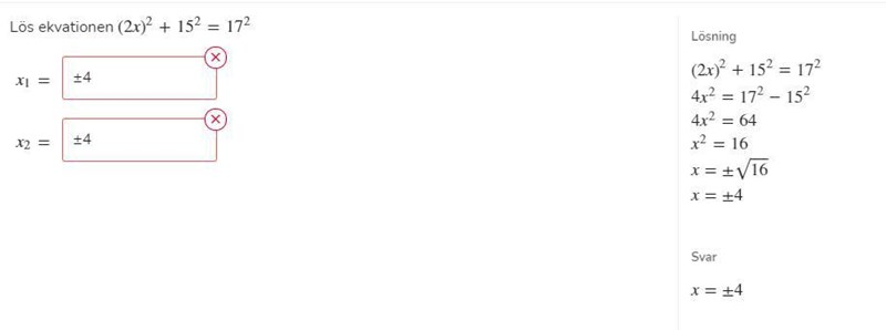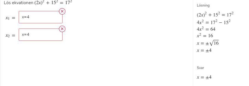 Lös ekvationen (2x)2+152=172