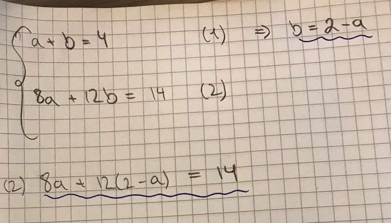 Fast du har gjort fel när du har löst ut b. Ekvation 1 ger att b = 4-a.
