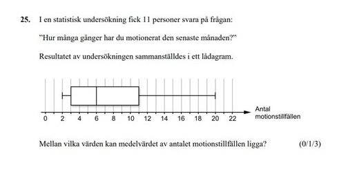 Oj, jag räknade fel på antalet termer.  Vi börjar om: 2 x x x x 6 x x x x 20.  Det jag glömde är att om det är ett udda antal termer så tar man inte med medianen när man räknar ut kvartilerna.  Då är 3 det mittersta av de 5 minsta talen och 11 det mittersta av de 5 största talen. Då vet vi 2 x 3 x x 6 x x 11 x 20.  Kan du ersätta alla x med så små respektive stora tal som möjligt och räkna ut minsta och största medelvärdet?