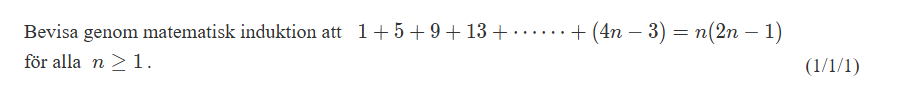 Jag skrev kursprov i ma5 för några veckor sedan. Det som verkar finnas på typ varje kursprov, både mitt och gamla: Några A-frågor på induktion.