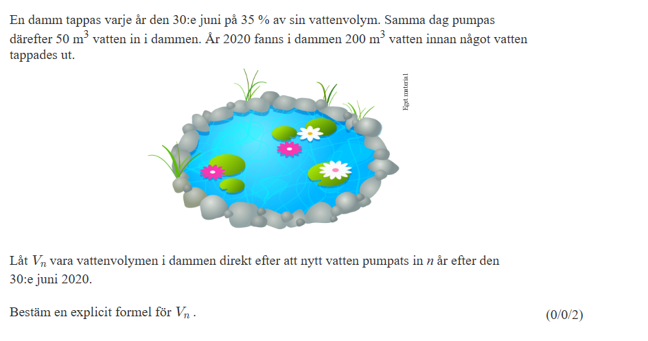 Det fanns även denna, jag bevisade min formel med induktion efter att jag härledde den. Men det stod inget om det i bedömningsanvisningarna så jag vet inte om de bryr sig om det.Generellt kändes mitt prov ganska likt de gamla som är publicerade, ungefär samma svårighetsgrad och ungefär samma innehåll (Det höll inte mina klasskamrater med om dock! De tyckte vårt var svårare).