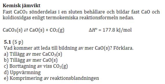 Hej! Hittade inget facit på denna fråga så ville bara kolla om jag tänker rätt. Tänker att man använder sig av Le Chateliers princip som säger att när en reaktion som befinner sig i dynamisk jämvikt ändras, så kommer detta att motverkas av reaktionen.