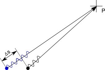 I detta fallet är vägskillnaden, delta-s, tre hela perioder på vågen. När den blå vågen har kommit fram till den högra streckade linjen så är de i fas och från den punkten har de samma avstånd till P. När båda vågorna når P så kommer de att förstärka varandra.