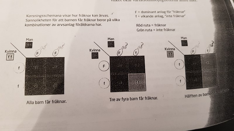 Den ena DNA-sekvensen, som vi kan kalla F, kodar för ett protein som påverkar cellerna i huden på ett sådant sätt att det bildas fräknar.
