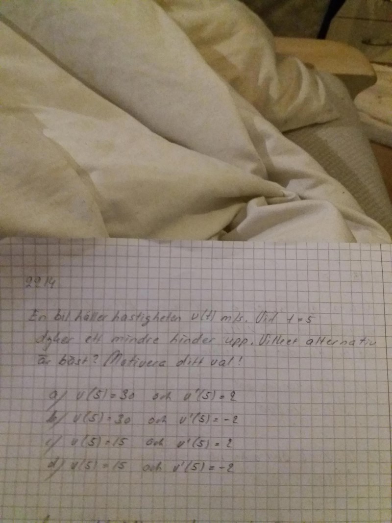 Ja att v(5)=15 v(5) = 15 betyder alltså att funktionsvärdet är 15 (eller att y-värdet är 15). Att v'(5)=-2 v'(5) = -2 betyder att kurvans lutning är -2 vid x=5 x = 5 .