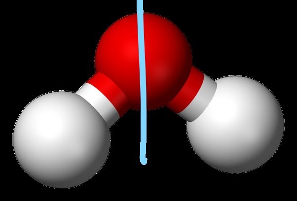 Vattenmolekylen är böjd. De tre atomerna ligger inte på en rät linje.