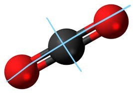 Här är en koldoxid, den är symmetrisk kring två linjer (de ljusblåa).