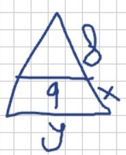 " I en likbent triangel dras en linje så att linjen delar triangeln i en topptriangel och ett parallelltrapets. Topptriangelns bas blir gemensam med enav sidorna i parallelltrapetset och får längden 9,0cm. Topptriangelns andra två sidor blir då 8,0 cm vardera.Beräkna längden av paralleltrapetsets sidor om topptriangeln har lika stor omkrets som paralleltrapetset."