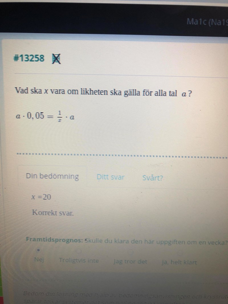 - : då kan vi dividera bort a från bägge sidor och vi har då endast kvar 0,05 = 1/x, dvs x = 20.