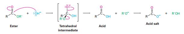 Hydrolys av estern (=förtvålning) är en långsammare process. Esterbindningen är stabil under neutrala förhållanden men kan brytas under sura eller basiska förhållanden. Om en bas gör en nukleofil attack på karbonylkolet kan OR'-gruppen lämna vilket bildar en karboxylsyra som sedan kan omvandlas till ett salt (se bild). Endast om basen fortfarande är närvarande i tillräcklig mängd efter att neutralisationsreaktionen skett kommer estern att hydrolyseras.