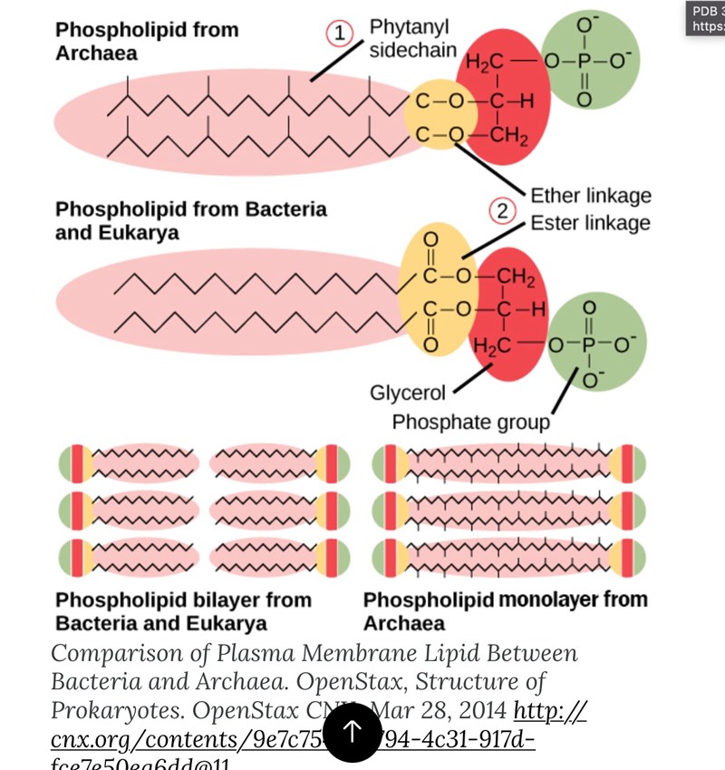 Och bindningen till glycerol är en eter, inte en ester som finns hos bakterier och eukaryoter. Och eterbindningen är kemiskt sätt mer stabil än esterbindningen, den är svårare att hydrolysera (klyva).