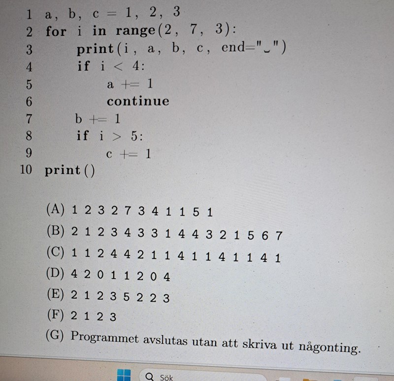Hej! Jag valde alternativ G) men förstår inte varför rätt svar är 2 1 2 3 5 2 2 3. Jag tänker vi börjar från i =2 och sen ska vi stanna vid 7 (exkluderad) dvs 2,3,4,5,6 men eftersom vi hoppar 3 steg så blir det 2 ,5 så tänker jag mig att den tittar på när i är mindre 4 vilket är då i=2 och sen får vi a=2 och b=3 , men sen när den ska gå till i=5 så tänker jag mig att villkoret inte uppfylls.