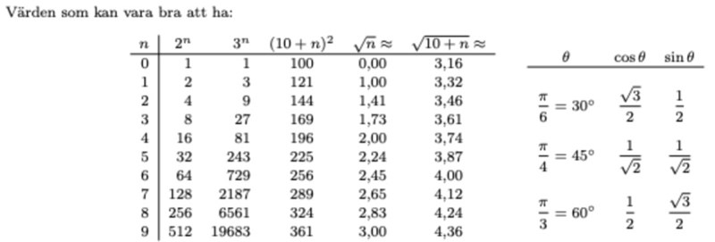 Den högra tabellen innehåller flera olika funktioner, längst upp, och sedan olika värden på variabeln n till vänster och i tabellen ser man funktionsvärde för det n-värdet.