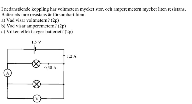 på b): i med att den är kopplat efter första lampan så borde den visa strömmen på andra lampan? Eller tänker jag fel? 1,2-0,30?