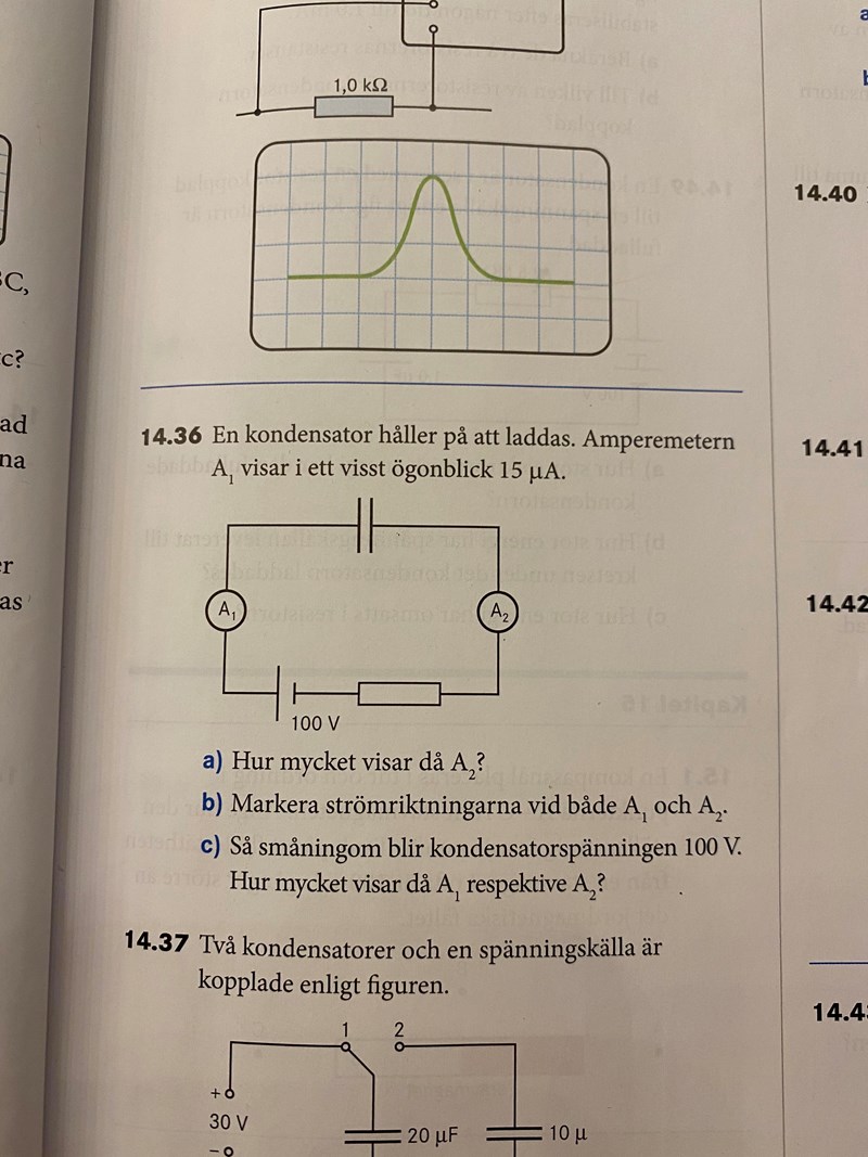 Vad visar amperemeterna när kondensatorspänningen höjs till 100V? Uppgift 14.36