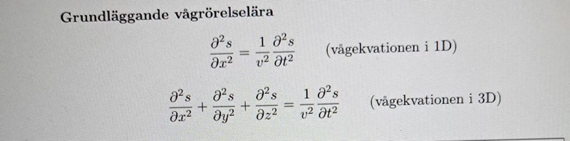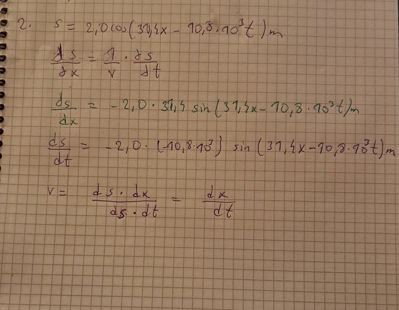 Ja okej. Jag försökte derivera s(x, t)=Acos(kx-wt) med avseende på x och t ,men det kanske går emot vågekvation formeln som vi har i #1. Om man löser ut v^2 ur den så får man v^2= D2s*Dx^2/D2s*Dt^2. Farten blir roten ur det uttrycket.