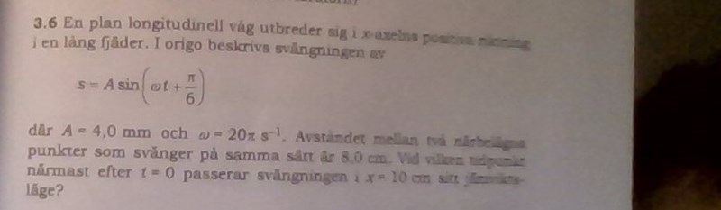 Hej, jag har försökt med den här uppgiften ett tag nu men kommer ingen vart. Det jag försökte göra var att skriva om den givna funktionen till den allmäna vågekvationen så att jag kan få ditt en term som beskriver vilken punkt man befinner sig på så att funktionen inte bara beskriver svägningen i origo, alltså y=Sin(2pi(10t-x/våglängden)+pi/6) men kommer ingen vart med det.