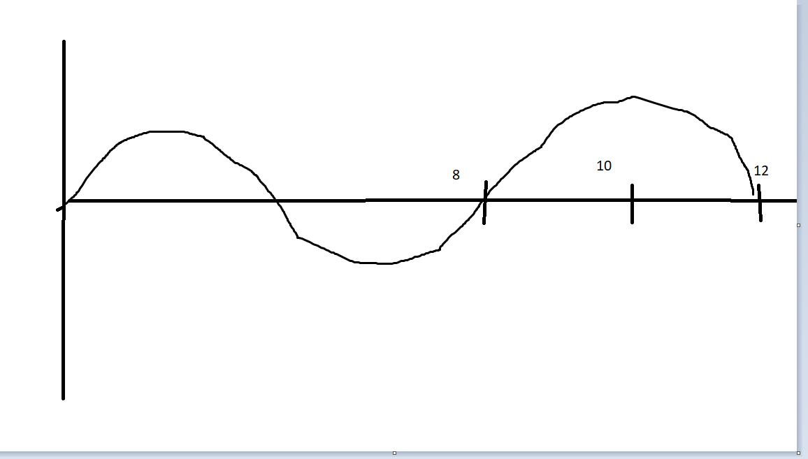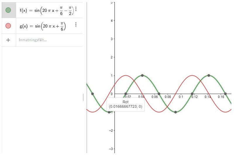 Punkten vid 10 cm ligger 90o efter 8 cm (och origo) och 90o före 12 cm (som är i motfas med origo)