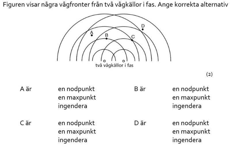 Punkt D blir bara påverkad av en vågfront från en vågkälla men då punkten inte är i mitten ligger den ej i vågdalen. Alltså ingen maxpunkt. Vilket betyder att svaret "ingendera" bör vara korrekt?