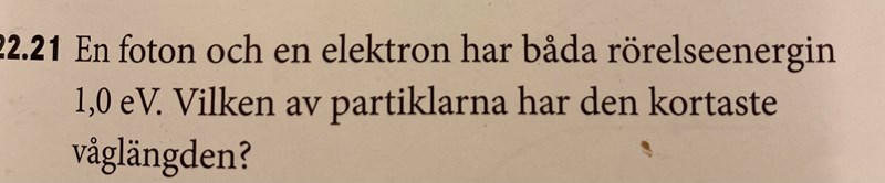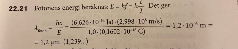 när jag skulle beräkna fotonens våglängd så tänkte jag att man ej vet utträdesenergin och om man ej vet den hur ska man då veta vad fotonens energi är ? Facit antar att utträdesenergin är 0 J ( antar jag ) då facit skriver att fotonens rörelseenergi är fotonens energi trotts att formelsamlingen säger att fotonens energi är rörelseenergin + utträdesenergin. Varför gör facit på detta sättet ? Varför struntar facit i utträdesnenergin? Tack på förhand!