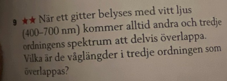Behöver hjälp med fråga 9. Vet att våglängderna överlappar om vinklarna är den samma, men vet inte hur jag ska gå vidare