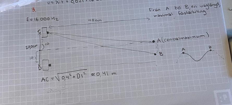 Så om ljudhastigheten är 340 m/s blir våglängden 2,1 cm och vägskillnaden ungefär 2½ våglängd - destruktiv interferens (om högtalarna är kopplade i fas).
