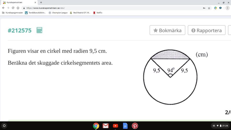 Kallaskull skrev:Börja med att räkna ut arean på hela cirkel sektorn genom gånger hela cirkels area. Sedan substrahera triangelns area, som du kan få fram med t.ex areasatsen