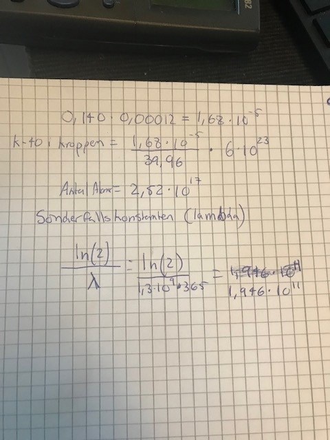 2) 0,14 * 0,00012 är inte antalet K-40 atomerna utan massan av K-40 i kroppen. Du ska dela detta med atommassan (39,96) och multiplicera med Avogadros tal (6*1023). So blir antalet K-40 atomer 2,52*1017