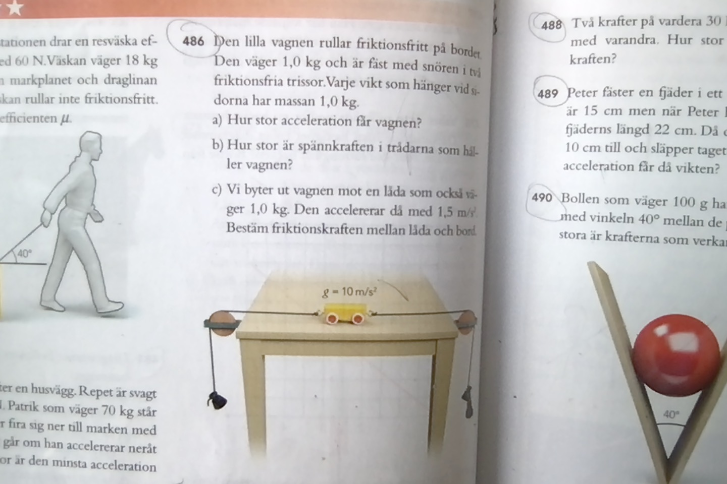 Har du lyckats ställa upp några ekvationer eller ritat ut krafter som verkar?