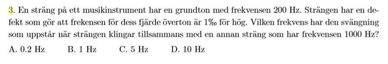 Fjärde övertonen borde ha frekvensen (4 + 1)*200 Hz, men istället har den tydligen frekvensen ... Hz.