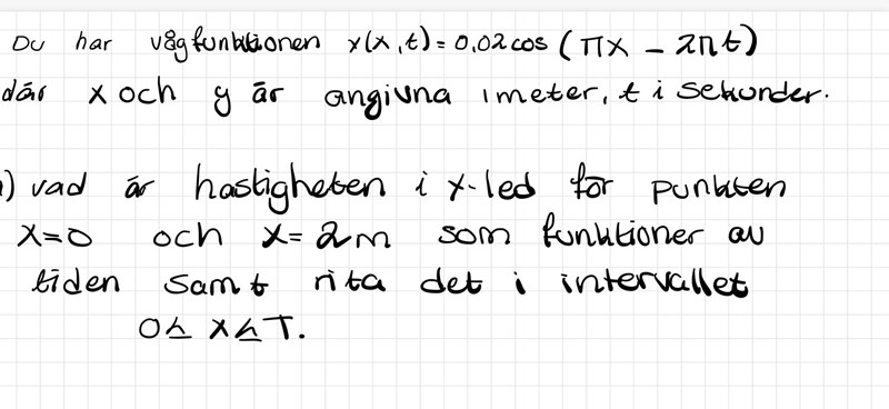 Om det är svårt att tolka en funktion av två variabler är det nog bäst att du börjar med att rita den givna vågfunktionen. Alltså dess värde på vertikal axel och tiden på den horisontella axeln.