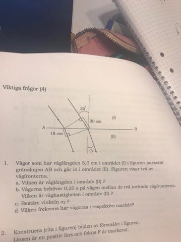 Dr. G skrev :Avståndet mellan de två vågfonterna är tydligen 30 cm i medium 1. I medium 2 är motsvarande avstånd 18 cm. Hjälper det?