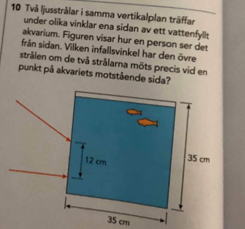 Du kan börja med att "rita" de röda linjerna i akvariumet. Om du vill få fram vinklar vad använder du då? Sedan använd brytningslagen och du borde lösa den galant.