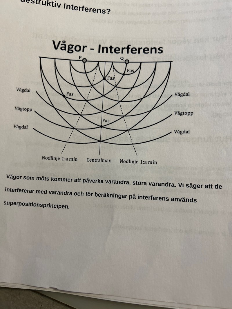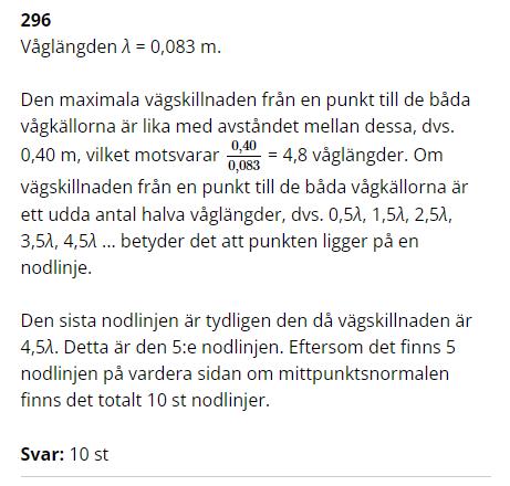 Två vågkällor A och B befinner sig på avståndet 0,40 m från varandra. Vågkällorna sänder ut cirkulära vattenvågor med våglängden 8,3 cm. Hur många nodlinjer uppstår om vågorna sänds ut i fas med varandra?